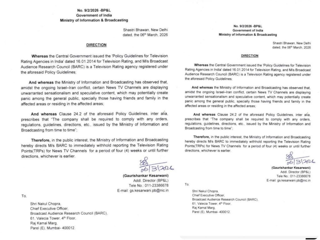 ఇజ్రాయెల్-ఇరాన్ యుద్ధం నేపథ్యంలో వార్తా ఛానళ్లు అనవసర ఉద్వేగాలను,ఊహాజనిత వార్తలను ప్రసారం చేయడంపై కేంద్ర సమాచార,ప్రసార మంత్రిత్వ శాఖ సీరియస్ అయింది.ఇరాన్,ఇజ్రాయెల్,అమెరికా యుద్ధ వార్తల ద్వారా అనవసరమైన భయాన్ని ప్రజల్లో సృష్టించి టీఆర్పీ పెంచుకుంటున్న టీవీ ఛానళ్లకు షాకిచ్చిన కేంద్రం నాలుగు వారాలు లేక తదుపరి ఉత్తర్వులు వచ్చే వరకు ఇండియాలో BARC రేటింగ్స్ను సస్పెండ్ చేసిన కేంద్రం.ఇజ్రాయెల్-ఇరాన్ యుద్ధం నేపథ్యంలో వార్తా ఛానళ్లు అనవసర ఉద్వేగాలను,ఊహాజనిత వార్తలను ప్రసారం చేయడంపై కేంద్ర సమాచార,ప్రసార మంత్రిత్వ శాఖ సీరియస్ అయింది.ఇలాంటి సంచలన వార్తలు యుద్ధ ప్రభావిత ప్రాంతాల్లో ఉన్న వారి కుటుంబ సభ్యుల్లో భయాందోళనలు సృష్టిస్తున్నాయని మంత్రిత్వ శాఖ పేర్కొంది.ఈ నేపథ్యంలో,ప్రజా ప్రయోజనాల దృష్ట్యా న్యూస్ ఛానళ్ల టీఆర్పీ (TRP) రేటింగ్లను తక్షణమే నిలిపివేయాలని బార్క్ (BARC) సంస్థను ఆదేశించింది.ఈ నిషేధం నాలుగు వారాల పాటు లేదా తదుపరి ఉత్తర్వులు వచ్చే వరకు అమలులో ఉంటుందని స్పష్టం చేసింది.